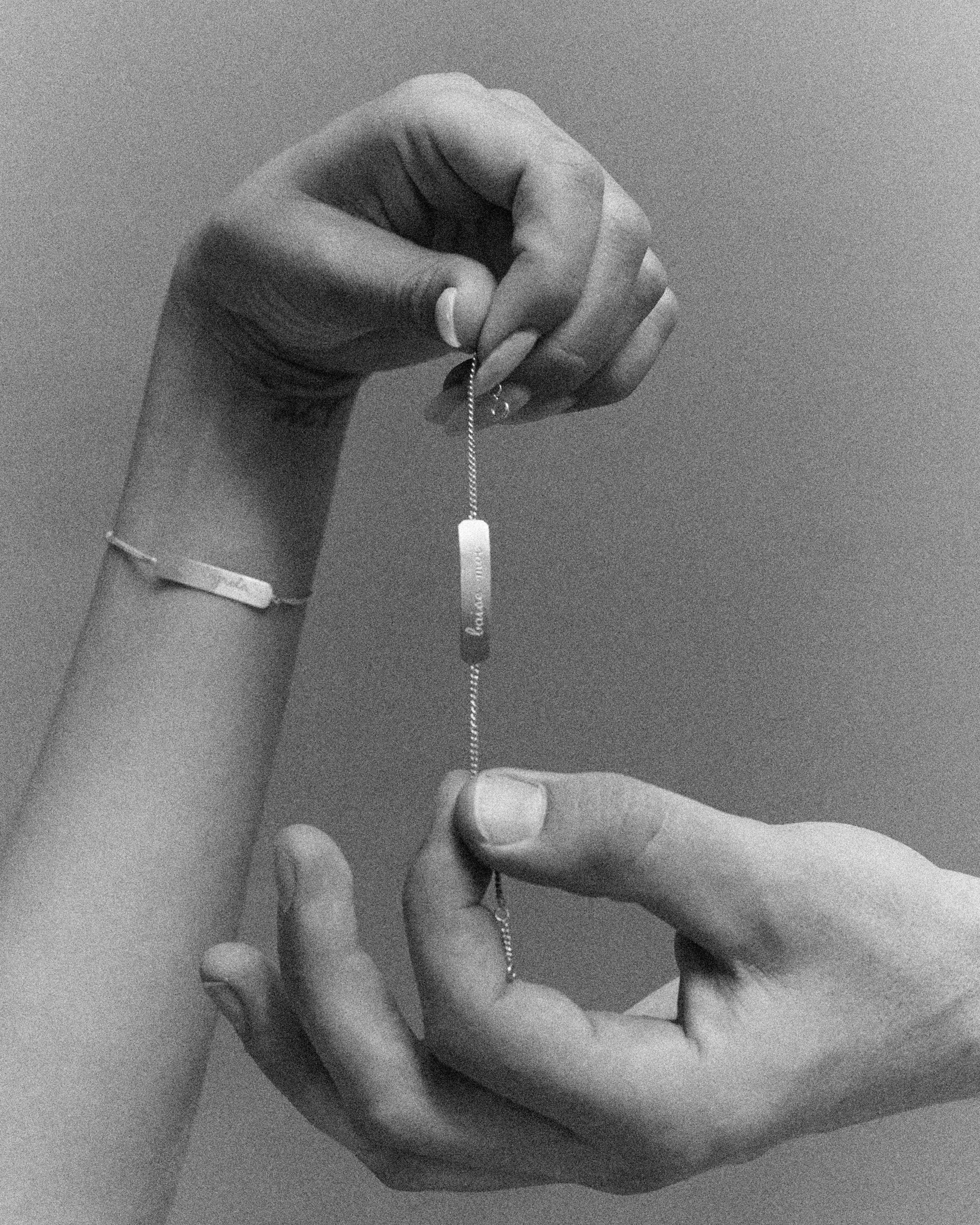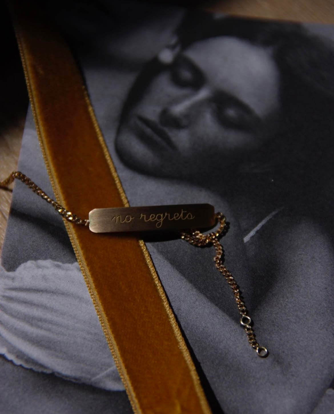 These bracelets are a collaboration between Bangla Begum and Henriette H. They are, in many ways, a perfect reflection of our worlds, and of our friendship. These gold bracelets are called gourmettes in French and they're a very quaint piece of jewelry that Henriette H and I decided to deflower. We engraved them with a feeling (amoureuse), a desire (baise-moi), a memory (no regrets). We wanted these bracelets from childhood to say something about life. This collaboration came out in 2021 and we called it the Three Ages of Love. Four years later, we added a fourth engraving (putain). We hope you love them as much as we do.