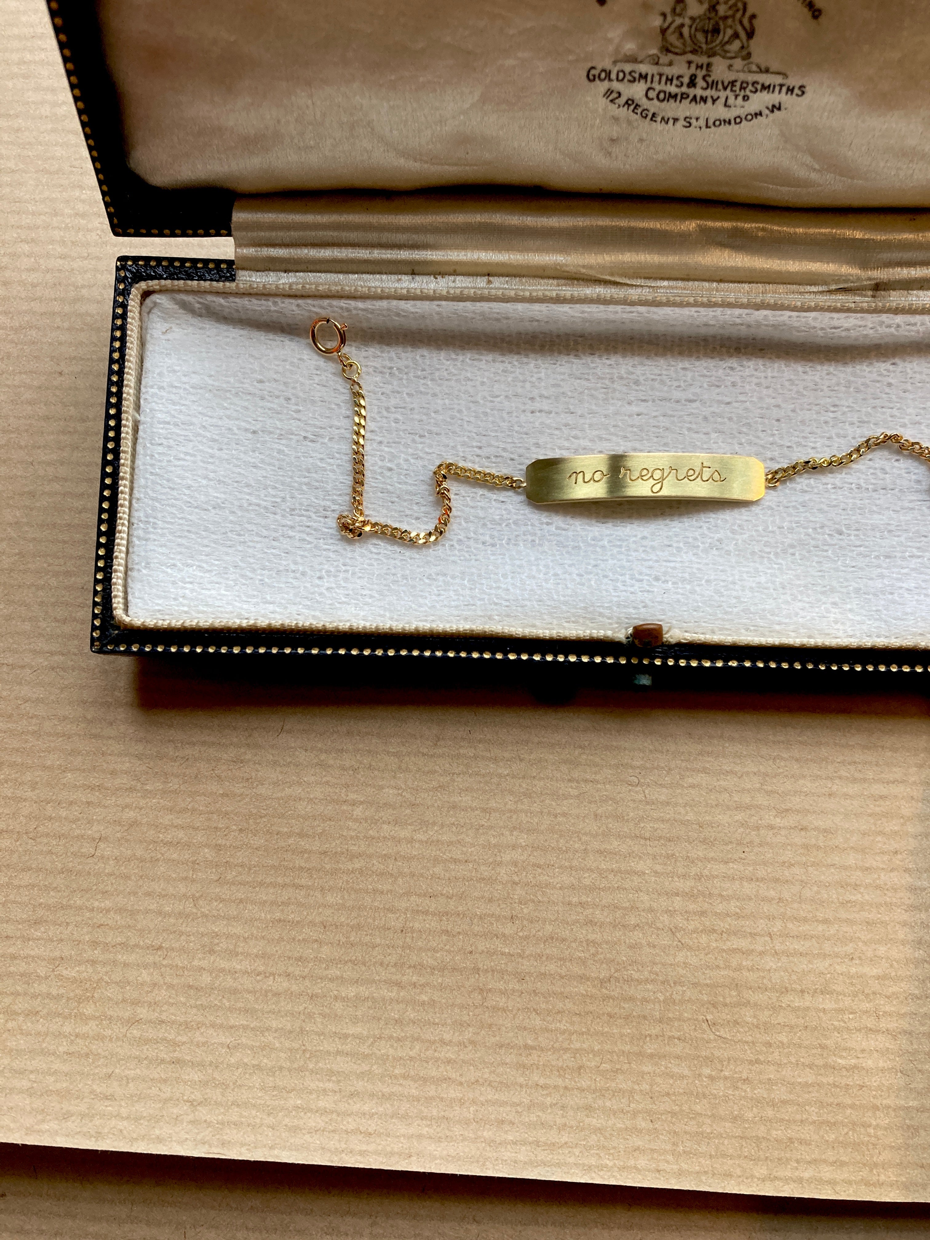 The No regrets bracelet is made to order, please allow two to three weeks for delivery. Please note that shipping is free within the EU for orders over 150€ and that our shipping fee for outside the EU includes duties and taxes. All our shipments are privately insured.
