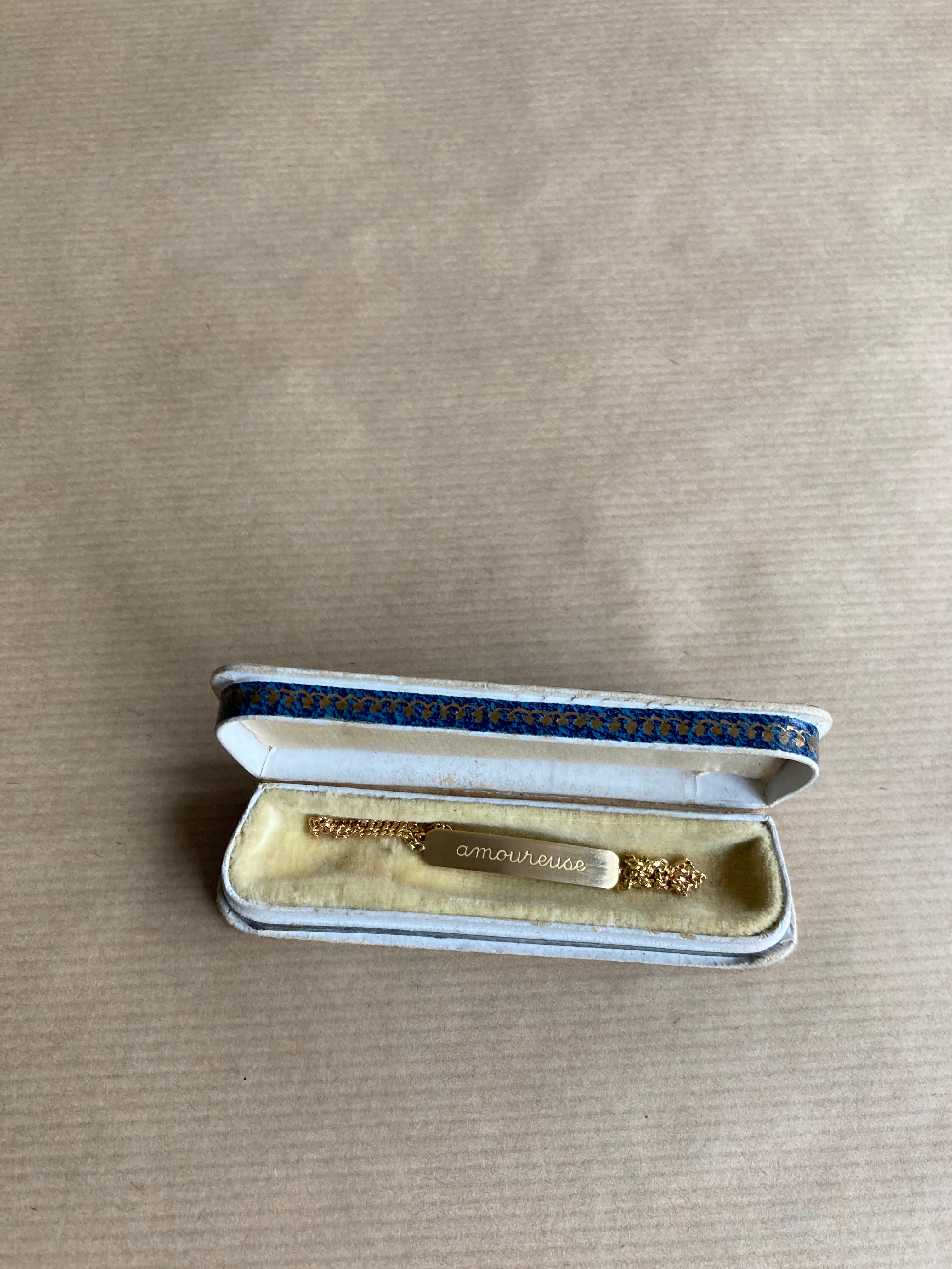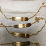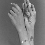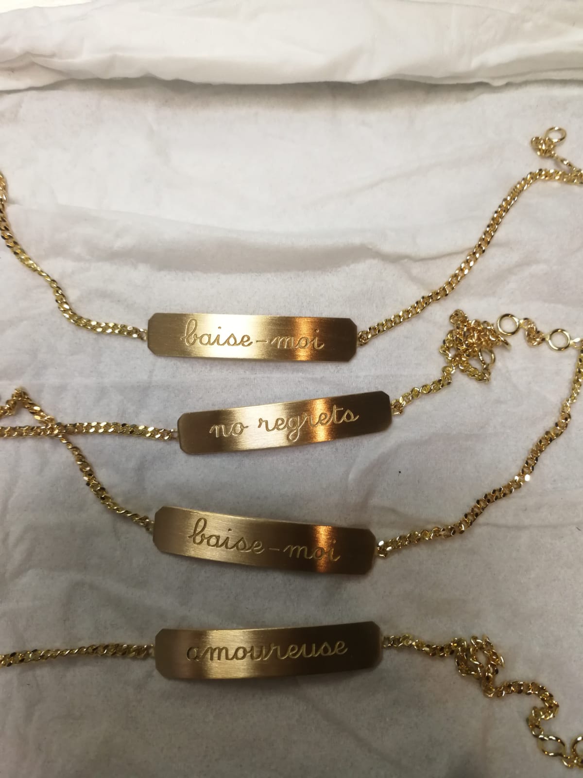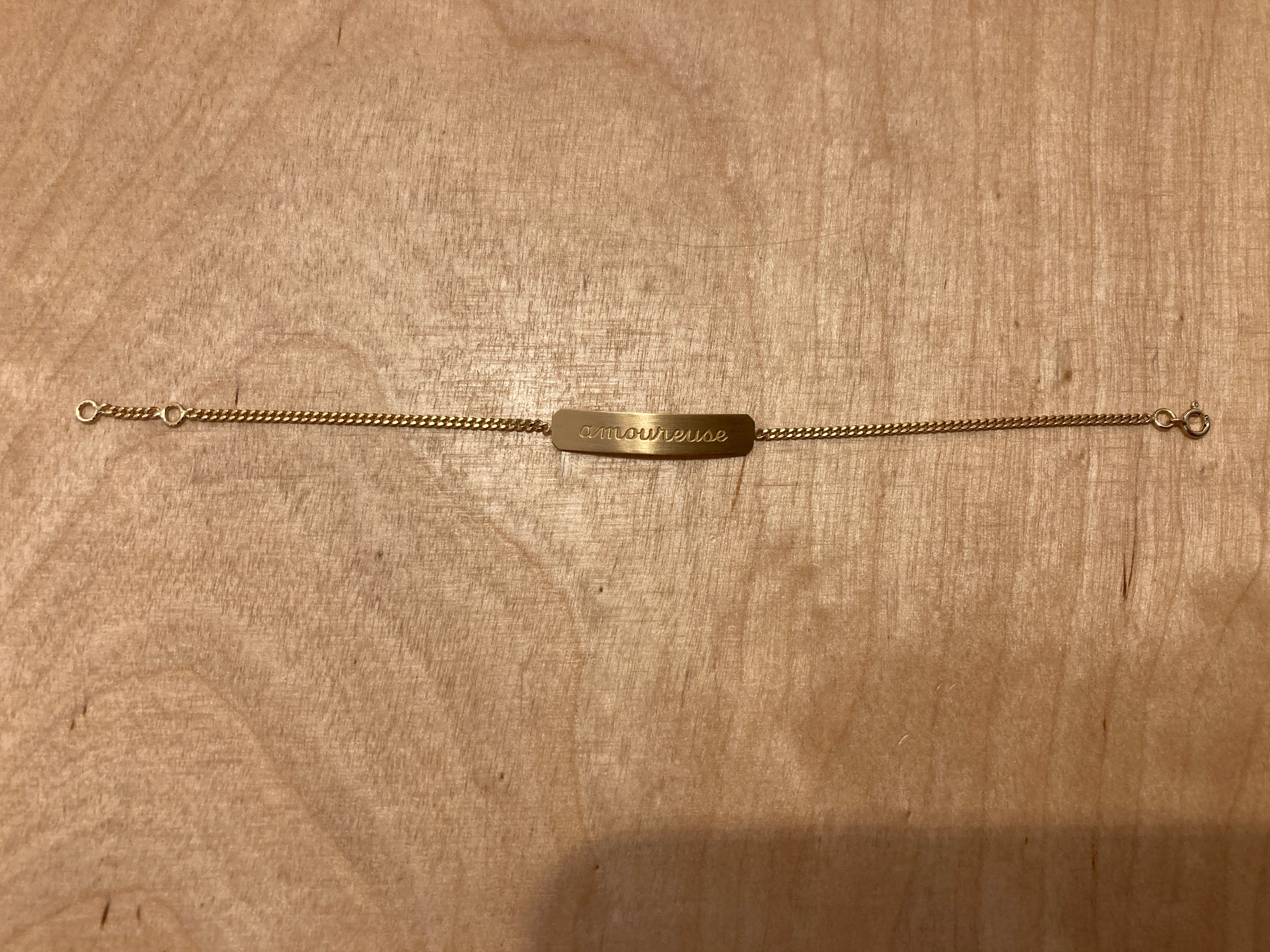 Ces bracelets sont le fruit d'une collaboration entre Bangla Begum et Henriette H. Ils reflètent à bien des égards nos univers et notre amitié. Ces gourmettes en or sont un bijou très original qu'Henriette H et moi avons décidé de déflorer. Nous y avons gravé un sentiment (amoureuse), un désir (baise-moi), un souvenir (no regrets). Nous voulions que ces bracelets d'enfance racontent quelque chose de la vie. Cette collaboration est sortie en 2021 et nous l'avons intitulée « Les Trois Âges de l'Amour ». Quatre ans plus tard, nous avons ajouté une quatrième gravure (putain). Nous espérons que vous les aimerez autant que nous.