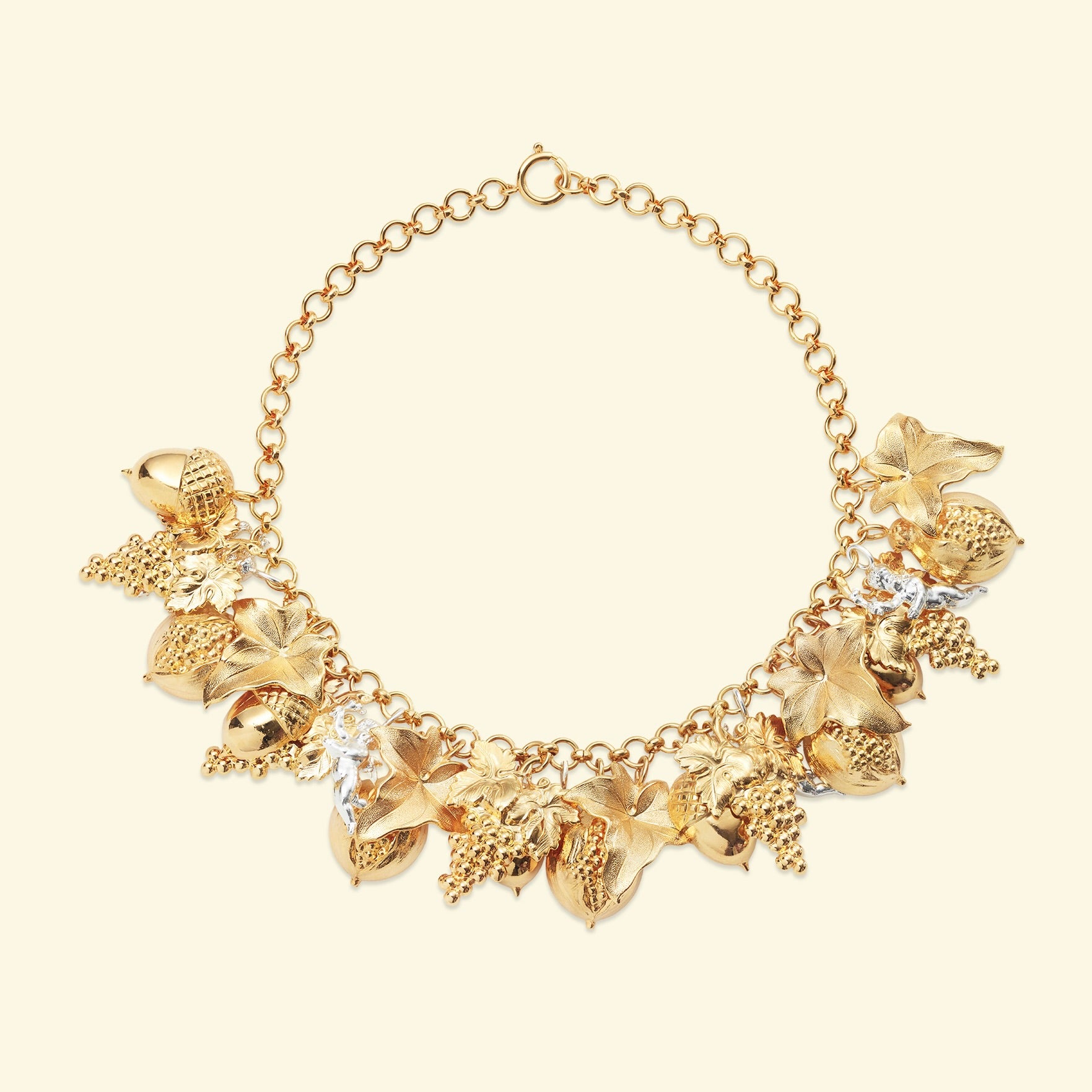 J'ai imaginé le collier Jardin des Délices comme un mélange entre l'univers des tableaux de maîtres anciens et celui de Versace ! Chaque élément a une signification sensuelle - d'où le Jardin des Délices - et le seul élément qui n'est pas terrestre, le chérubin, est trempé dans l'argent pour le distinguer. De plus, j'adore le bruit qu'il fait !