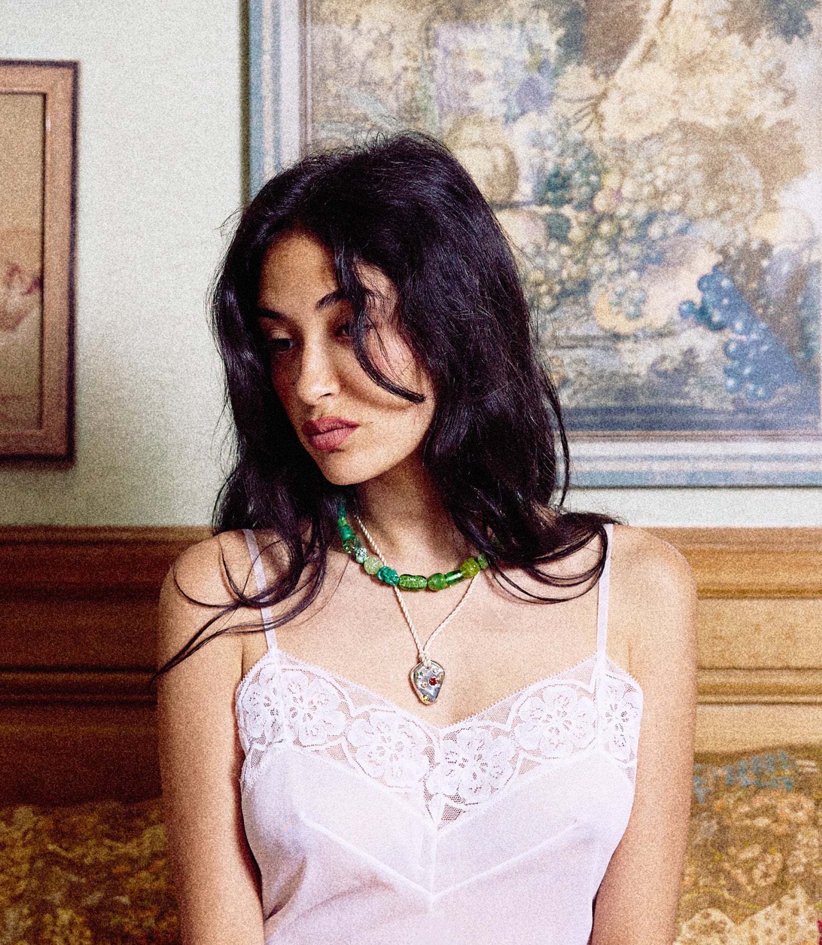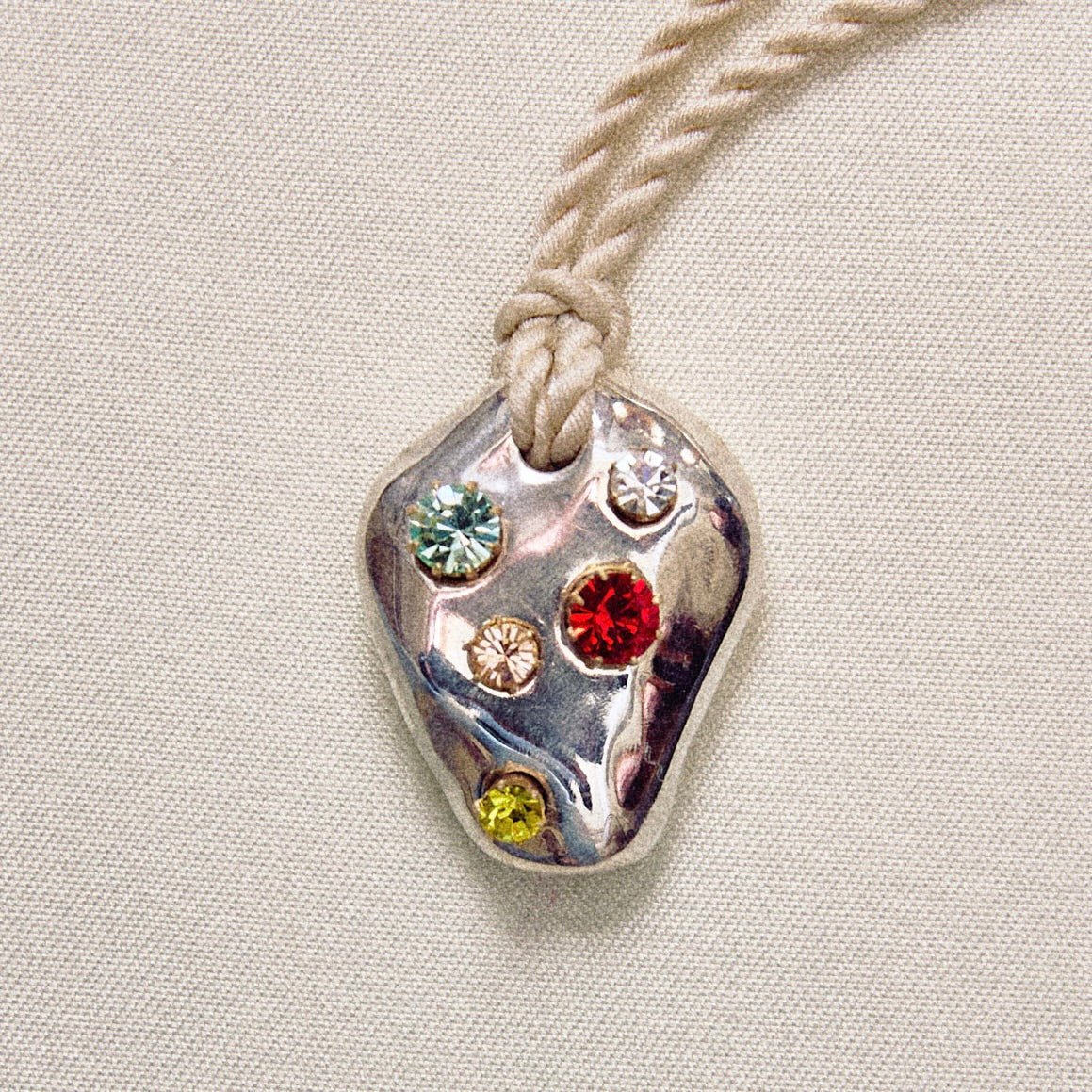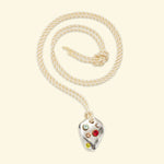 Le pendentif Ouda est sculpté à la main, puis moulé et coulé à Paris. Il représente un cœur (l'organe, et non le symbole). Les strass sont nos souvenirs, brillants en nous.