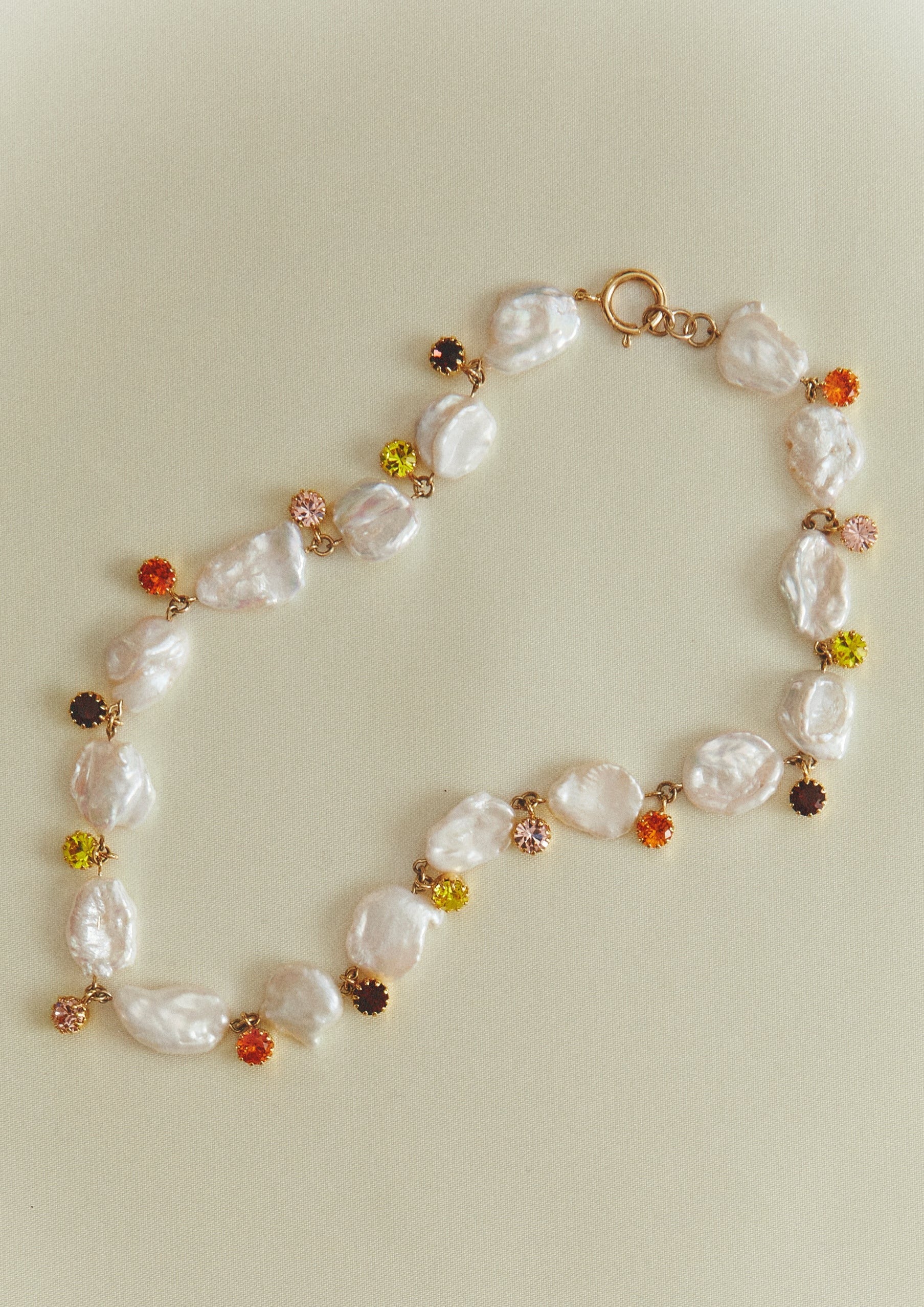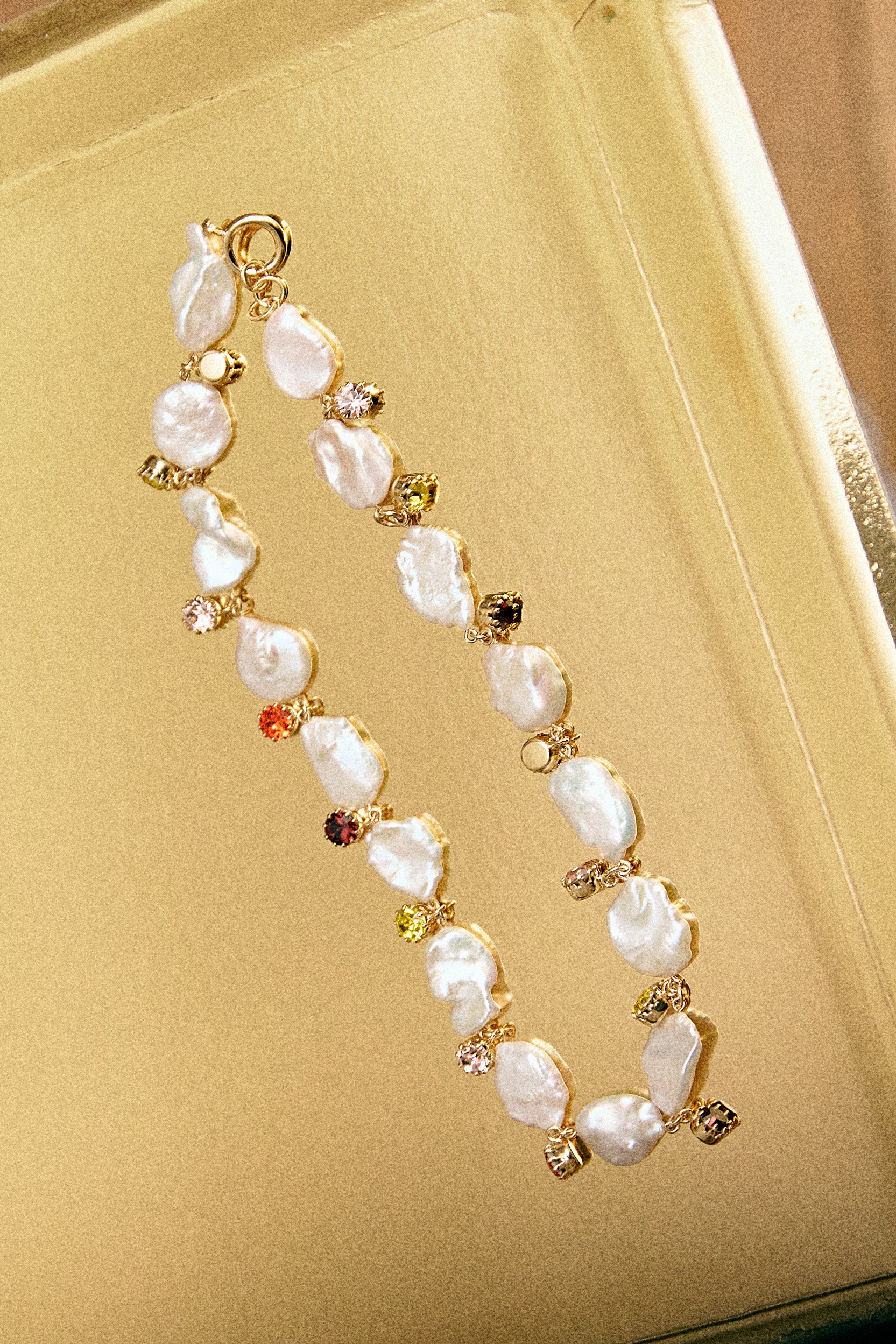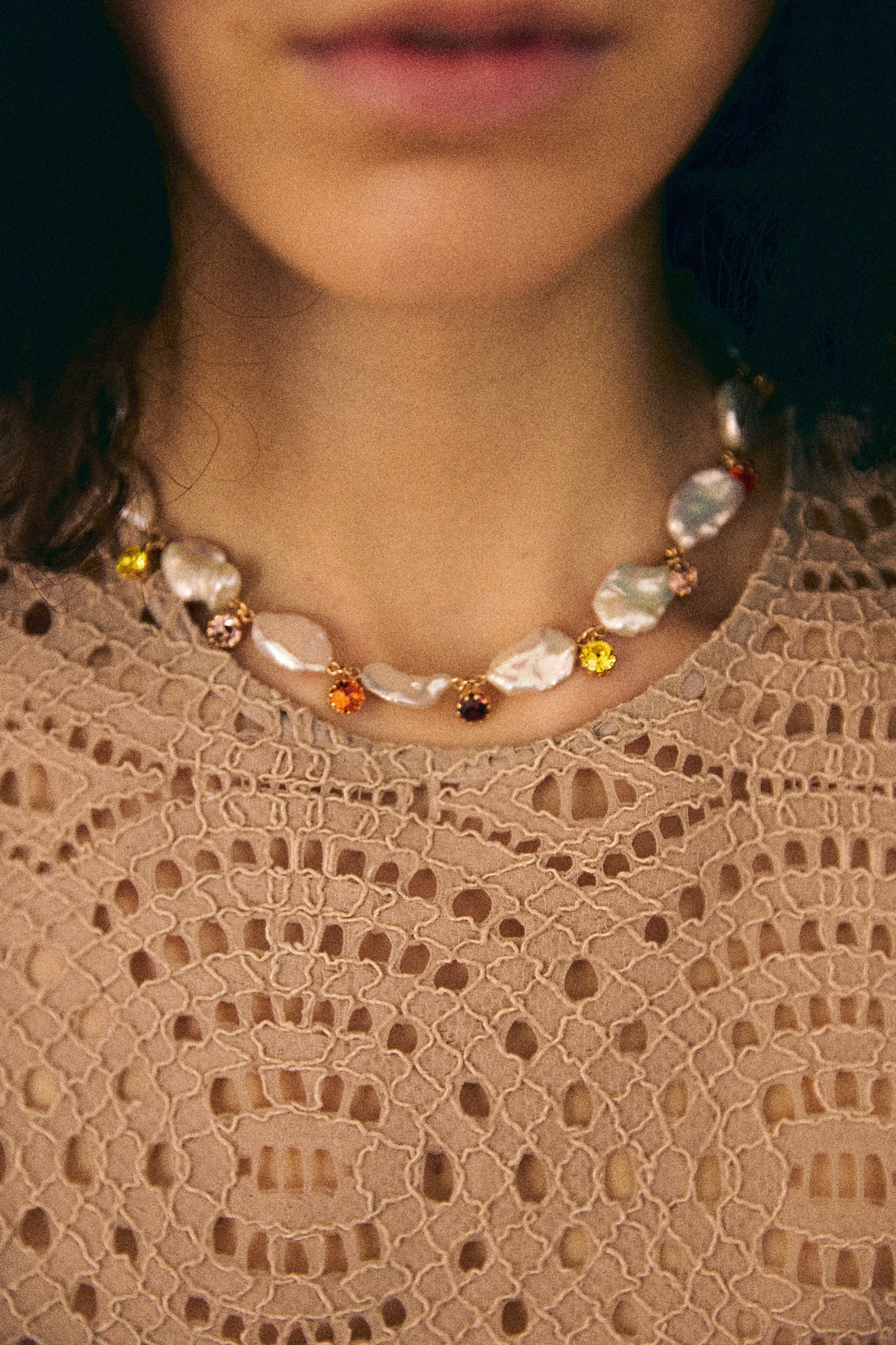 Le collier Salina est composé de véritables perles baroques et de strass montés sur une chaîne trempée dans l'or. Il mesure environ 40 cm et peut être ajusté sur demande.