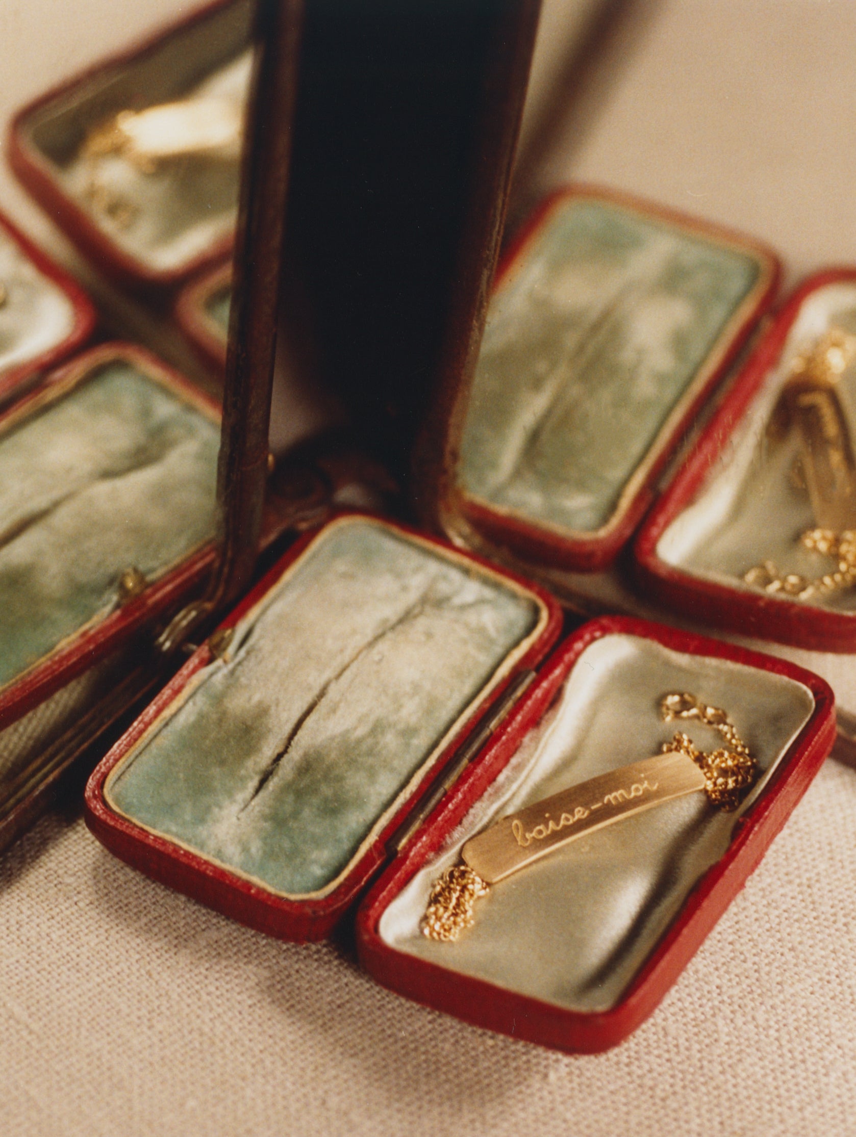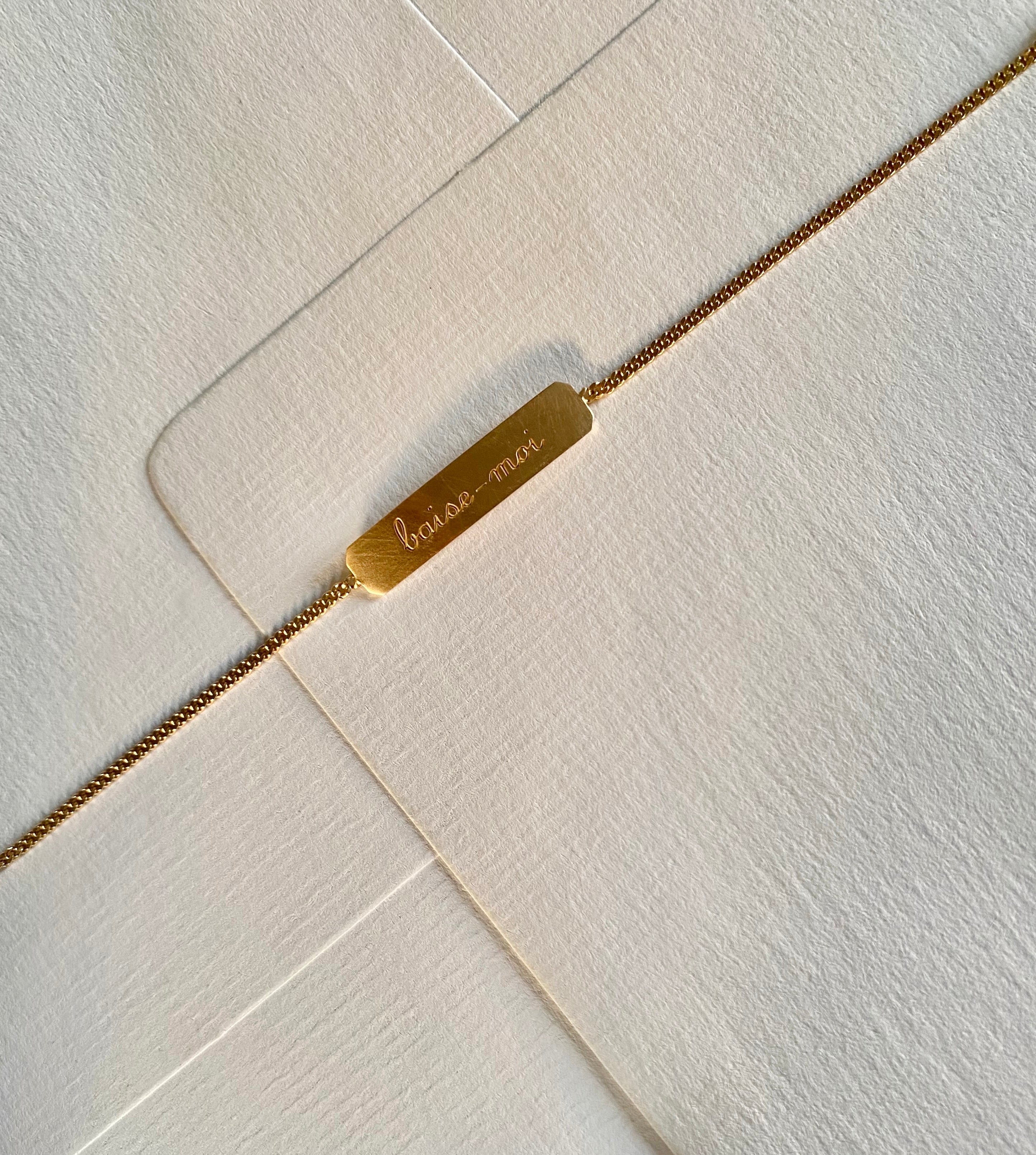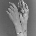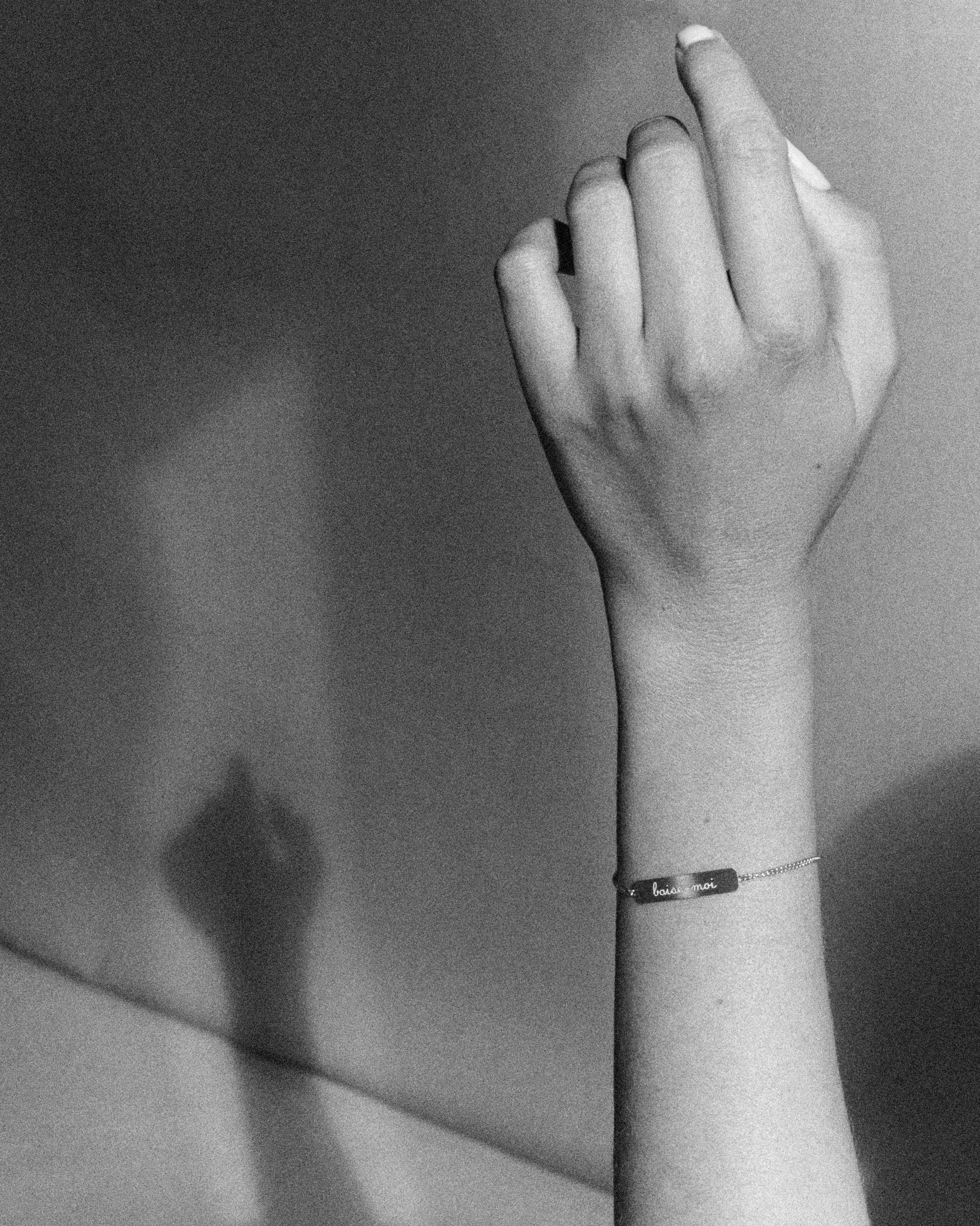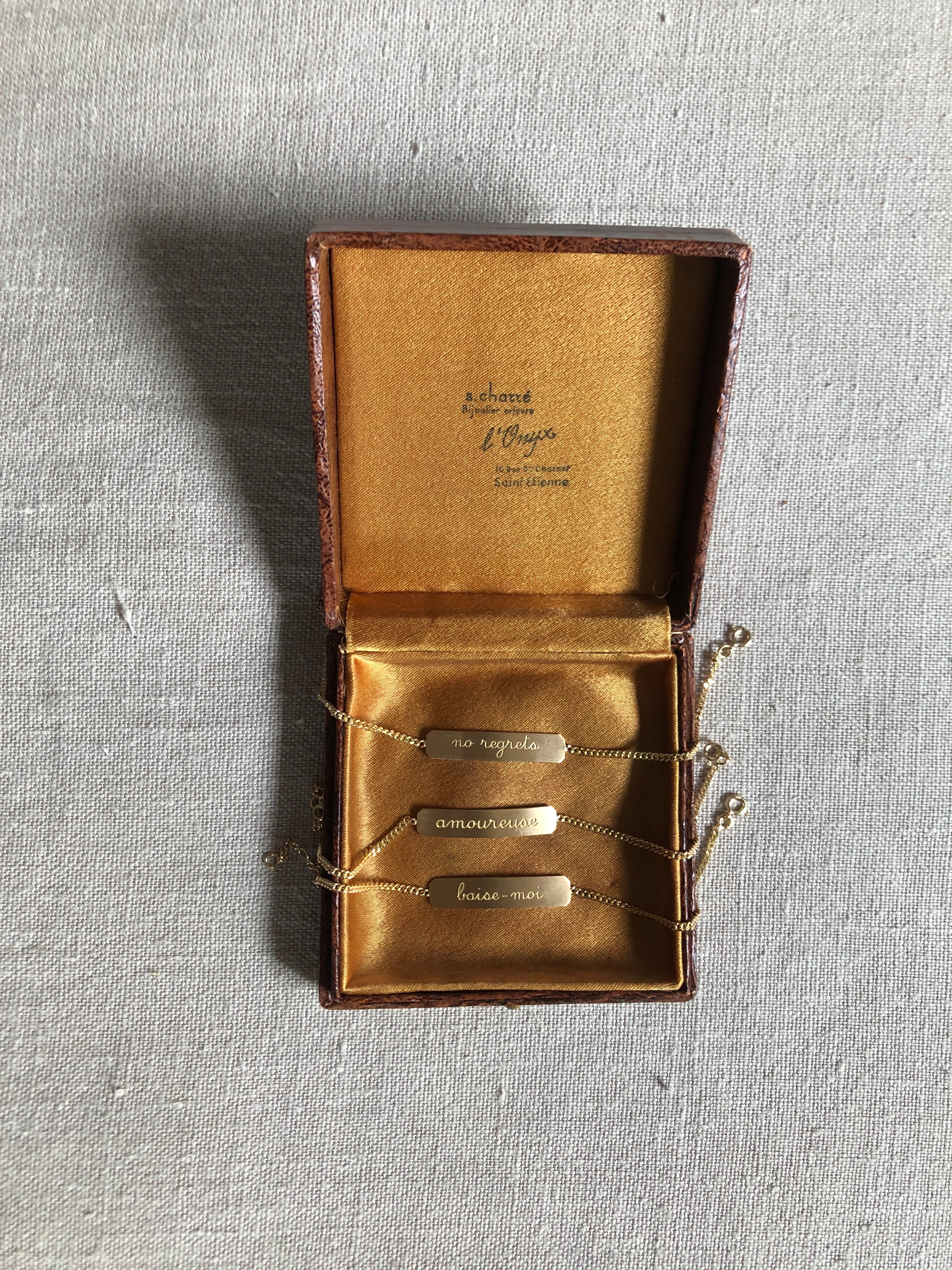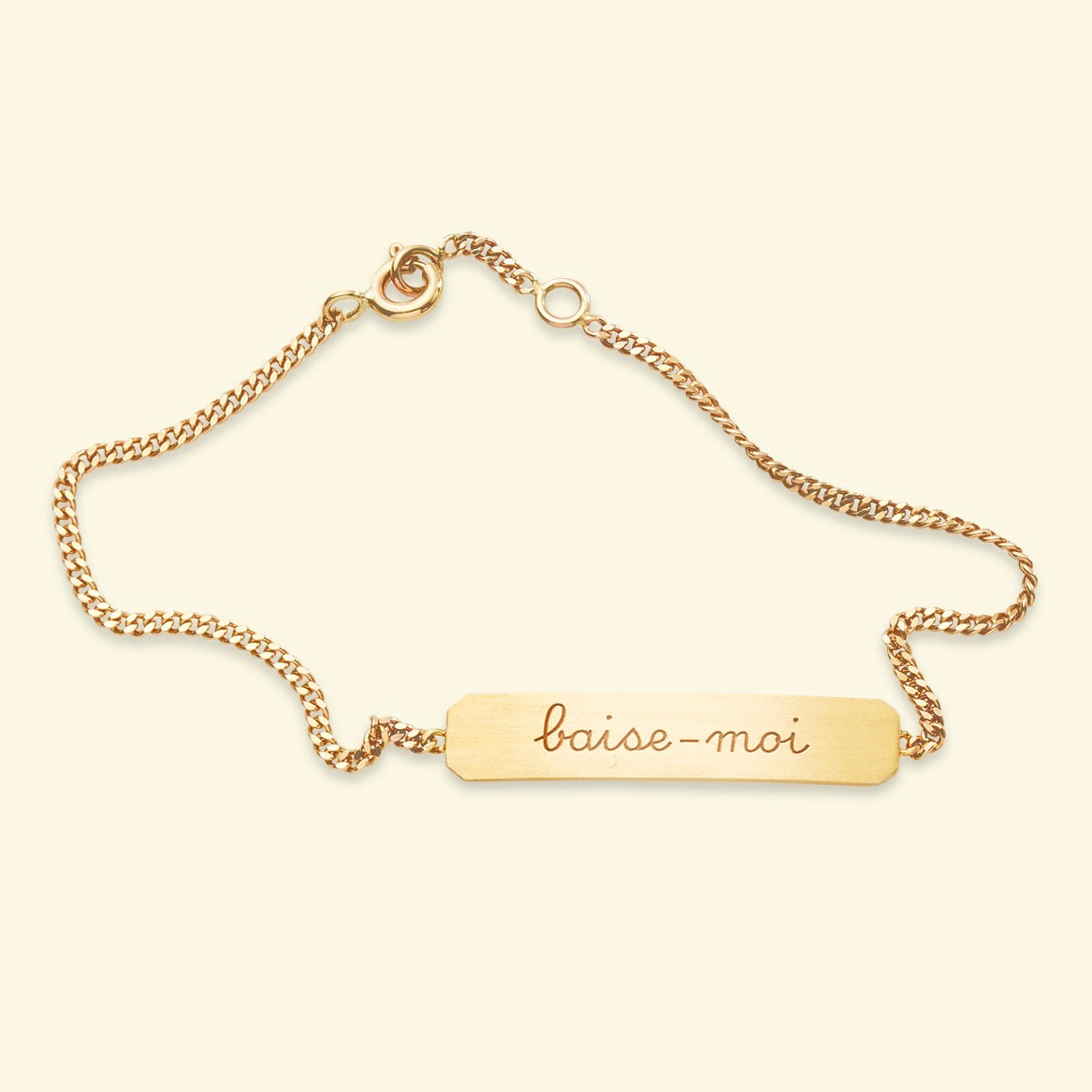 These bracelets are a collaboration between Bangla Begum and Henriette H. They are, in many ways, a perfect reflection of our worlds, and of our friendship. These gold bracelets are called gourmettes in French and they're a very quaint piece of jewelry that Henriette H and I decided to deflower. We engraved them with a feeling (amoureuse), a desire (baise-moi), a memory (no regrets). We wanted these bracelets from childhood to say something about life. This collaboration came out in 2021 and we called it the Three Ages of Love. Four years later, we added a fourth engraving (putain). We hope you love them as much as we do.