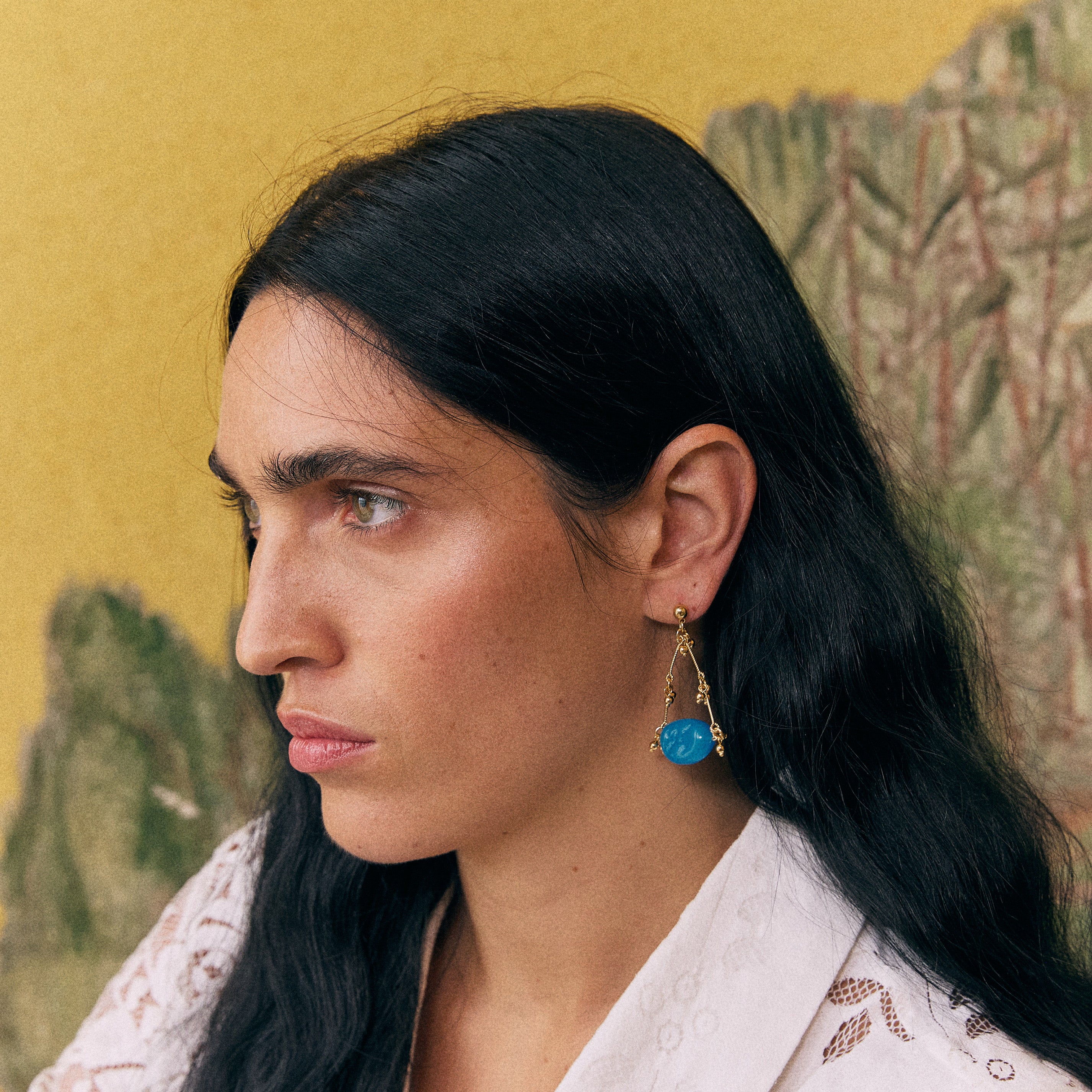 The newest member of the Gallipoli family, Azure, a bright, burning blue, like a sky seen with tinted glasses. It’s the most vivid of our three Gallipoli earrings, radiant and timelessly cheerful. The chain itself is gold-dipped brass, assembled by hand in our Paris atelier. Also, each glass bead is made especially for us, in France.
