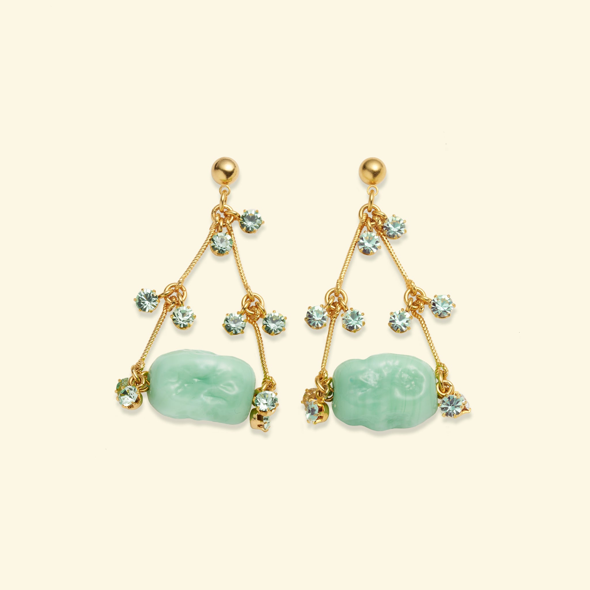 A long-awaited return, with a touch of sparkle. The Pistachio Gallipoli earrings (my favorite) combine their signature pale green glass beads with a gold-dipped chain meticulously strassed by hand in our Paris atelier. A delicate piece, full of grace and light. Also, each glass bead is made especially for us, in France.