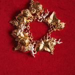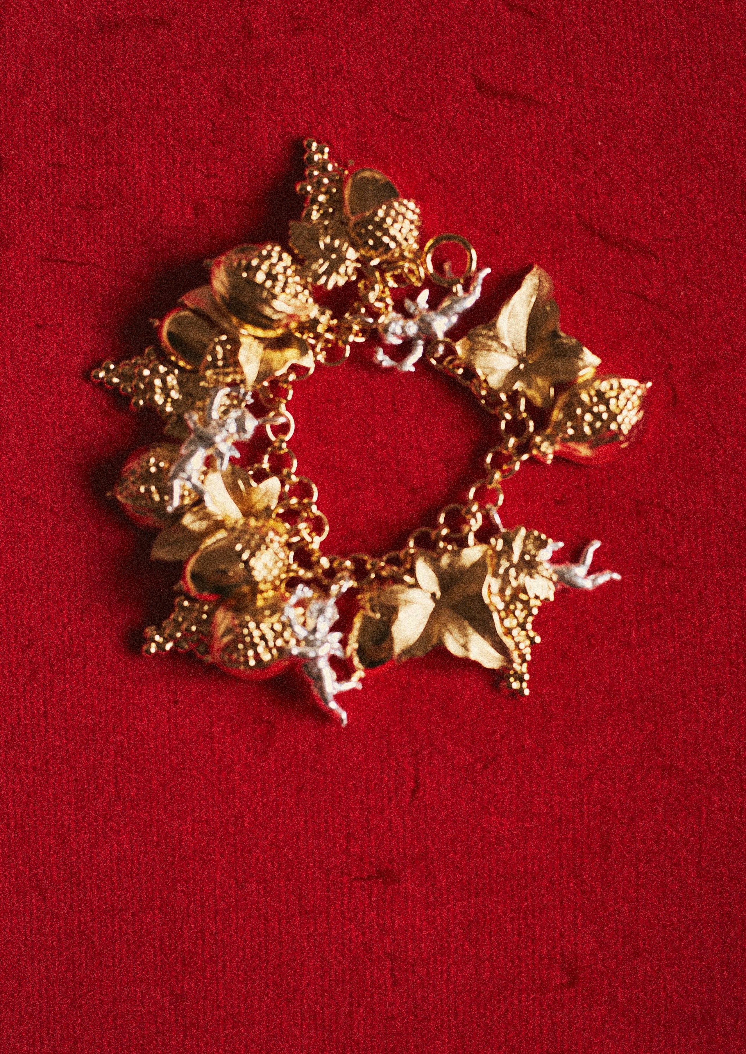 I imagined the Garden of Delights bracelet as a mix between the world of Old Masters paintings and the world of Versace! Every element has a sensual meaning - hence the Garden of Delights - and the only element that is not earthly, the cherub, is silver-dipped to set him apart. Also, I love the noise it makes!