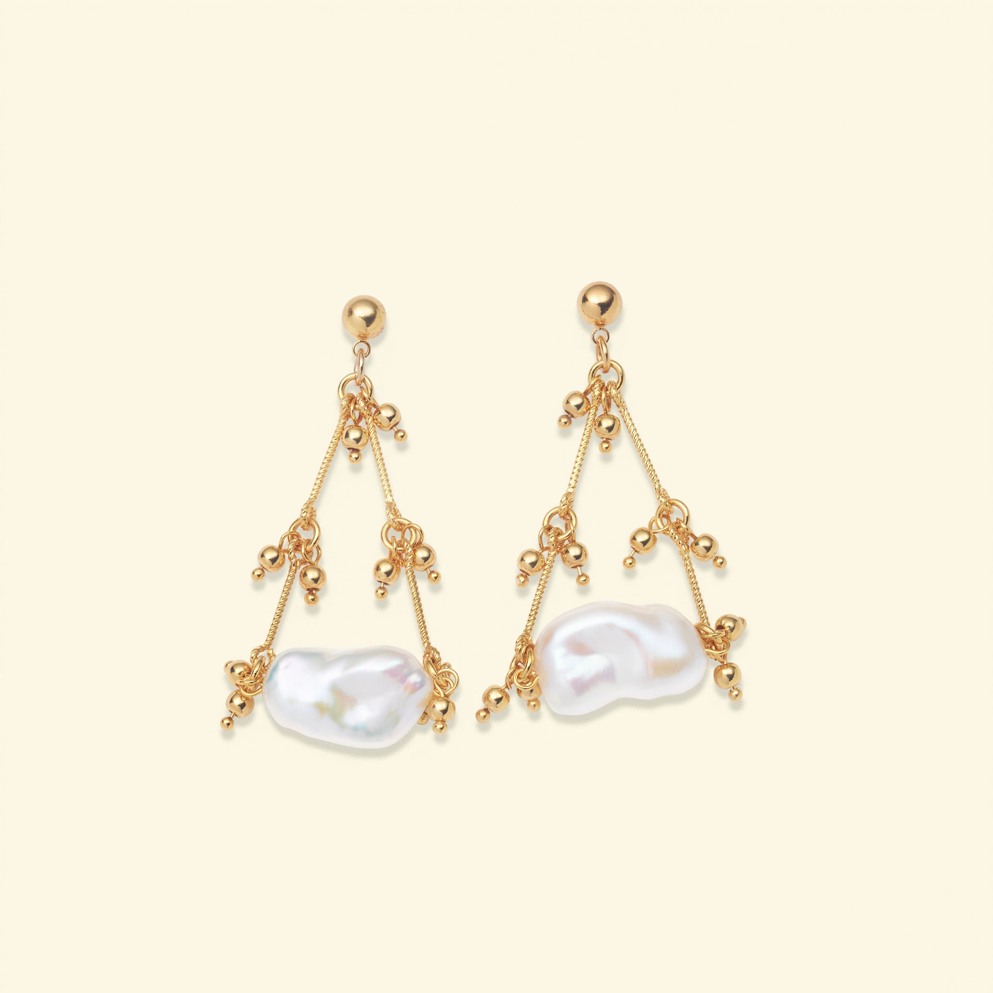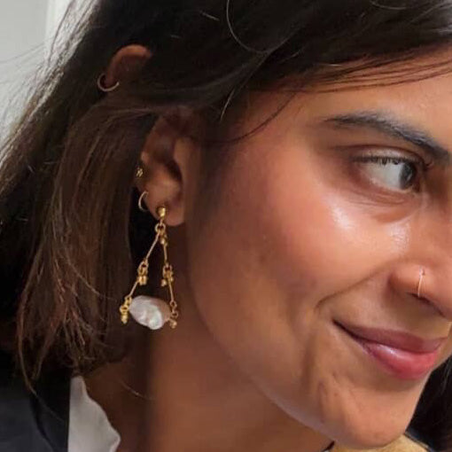 The very first Gallipoli earrings, now classics. White pearls on a gold-dipped chain, luminous, a little nostalgic, and endlessly wearable. They dangle with grace, make you want to dance. Also please note, the original Gallipoli earrings are made with freshwater pearls and are assembled by hand in Paris.