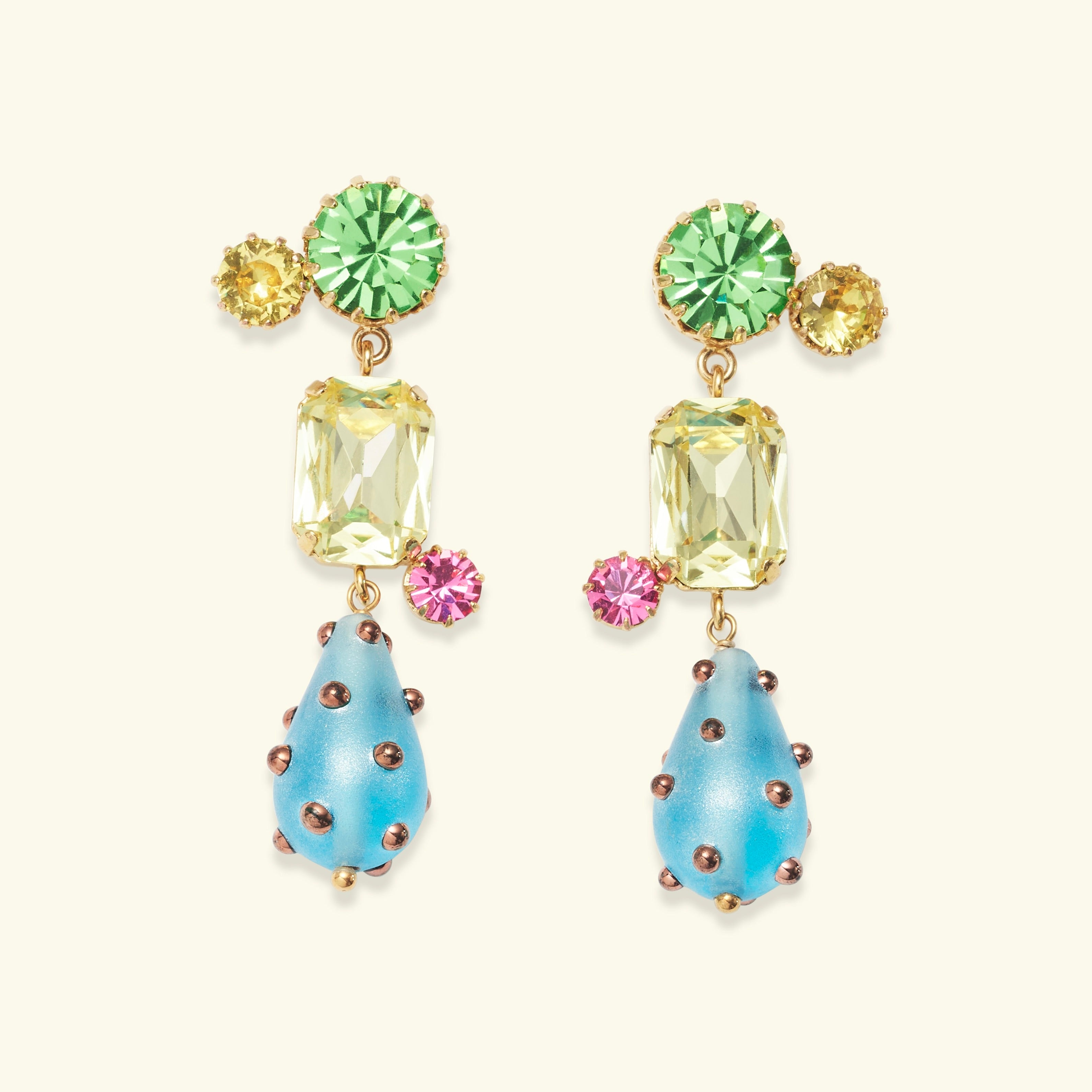 I wanted earrings that felt like cousins of the Tiziana torque: same sculptural energy, but a little crazier. So we made this little composition of glass and strass, like antique earrings that go dancing, slightly wild and unapologetically charming.